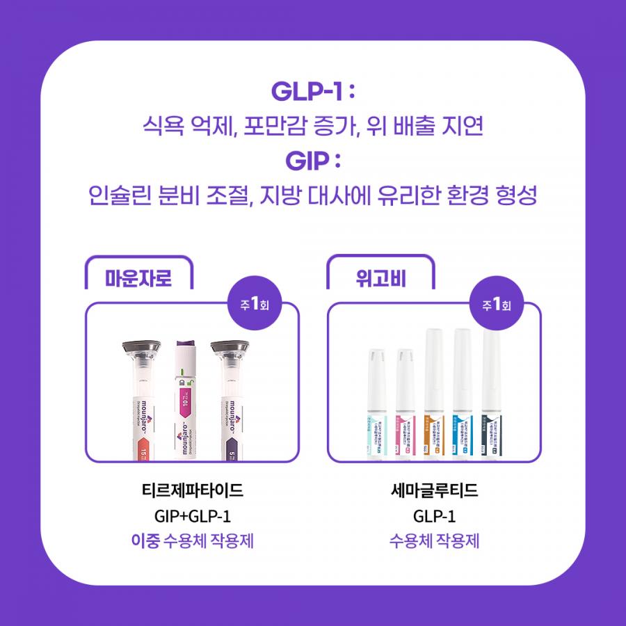 위고비는 GLP-1 단일 작용인 반면, 마운자로는 GIP와 GLP-1을 동시에 자극합니다.