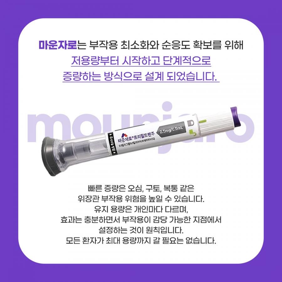 마운자로는 부작용 최소화와 순응도 확보를 위해 저용량 시작 → 단계적 증량으로 설계되었습니다.