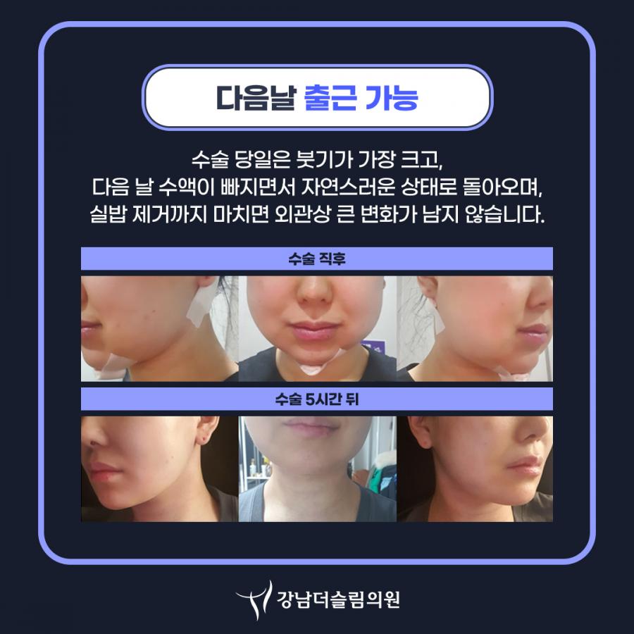 일정이 빠듯한 분들의 경우, 얼굴지방흡입 후 다음날에도 출근을 하시는 경우가 많습니다.