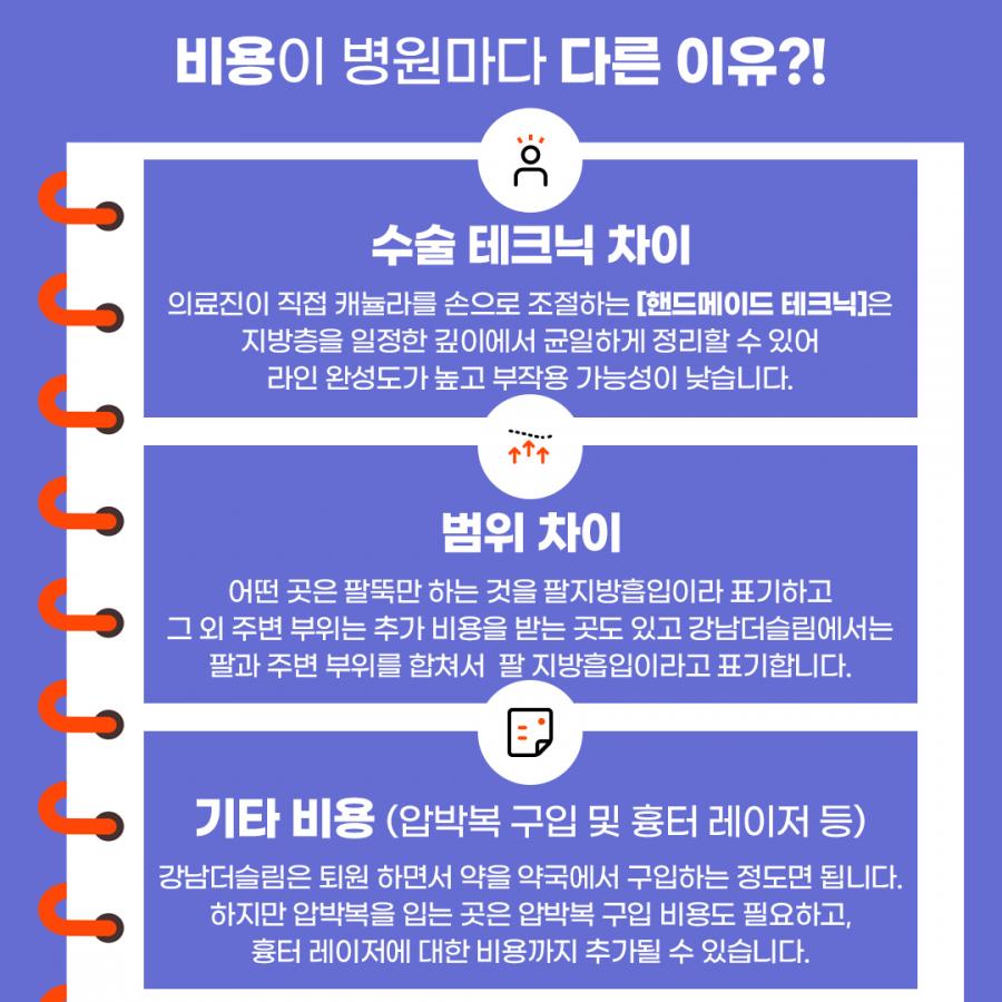 흡입 범위, 테크닉, 압박복과 흉터 등 회복의 편의성에 따라 달라진다고 볼 수 있습니다.