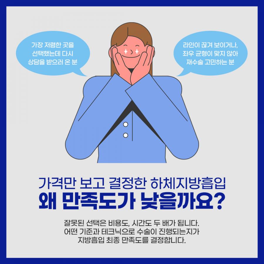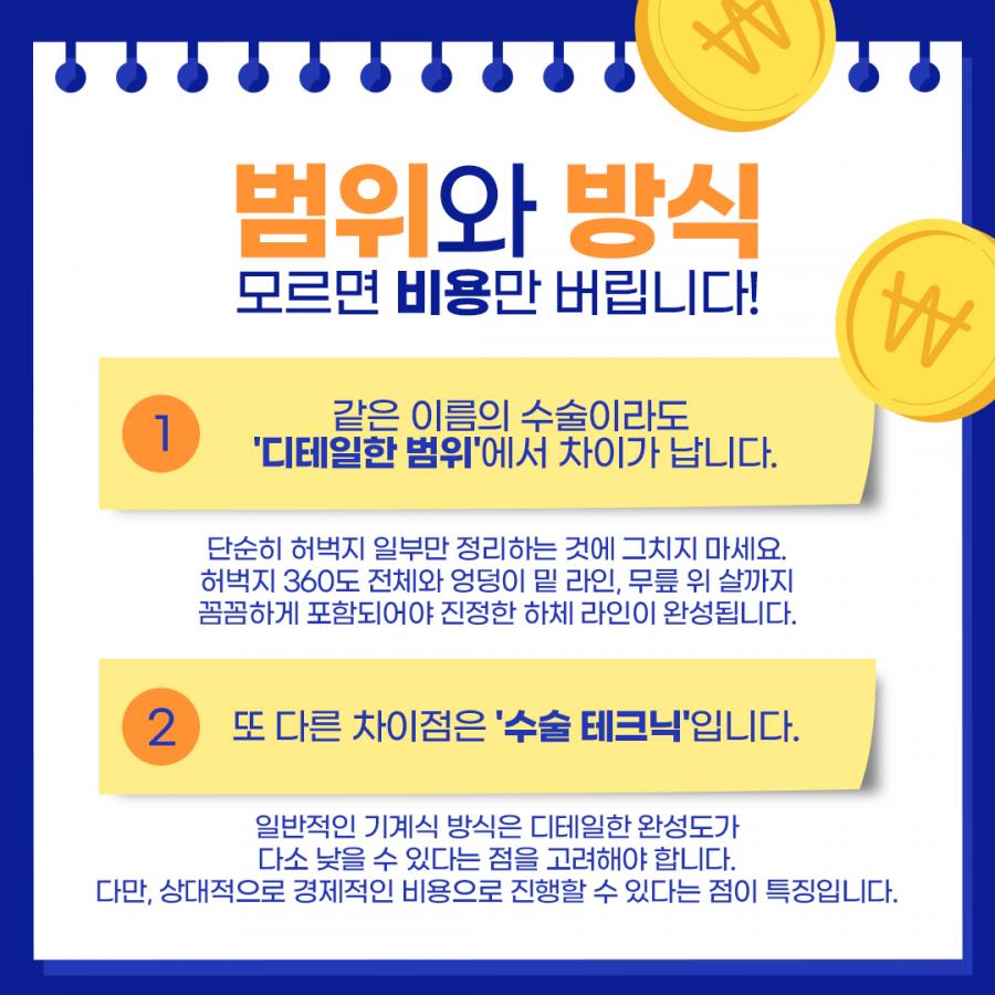 이런 요소들이 쌓여 하체지방흡입 비용의 차이로 나타나게 됩니다.