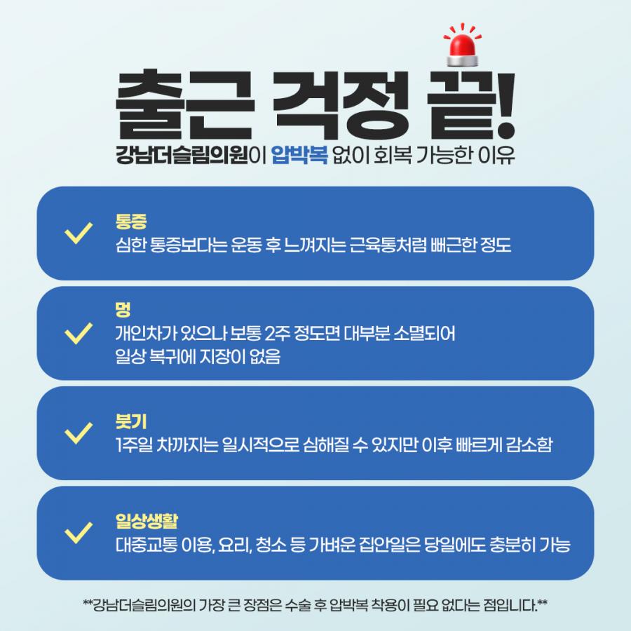 압박복을 필수로 착용하며 회복해야하는 특징이 있습니다.