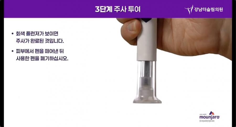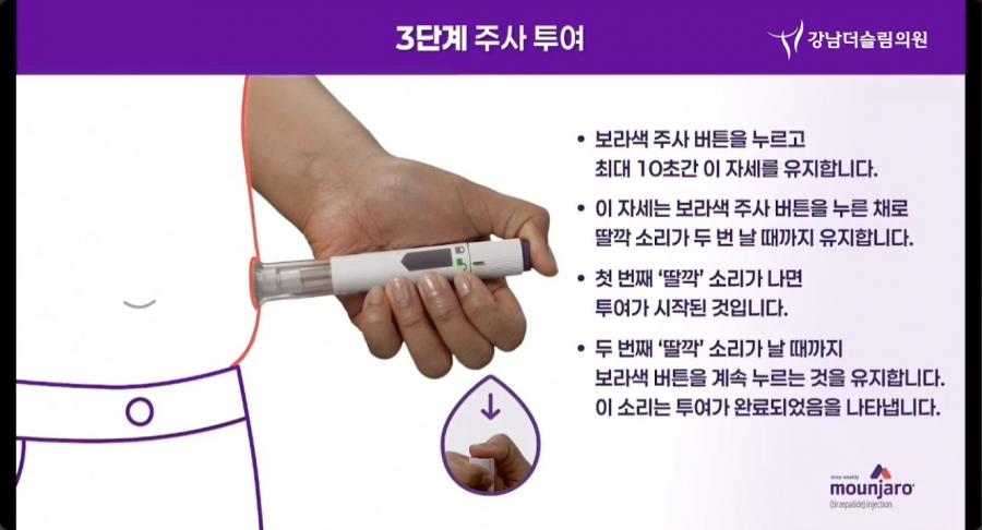 - 보라색 주사 버튼을 누르면 첫 번째 '딸깍' 소리와 함께 약물이 자동으로 투여됩니다.