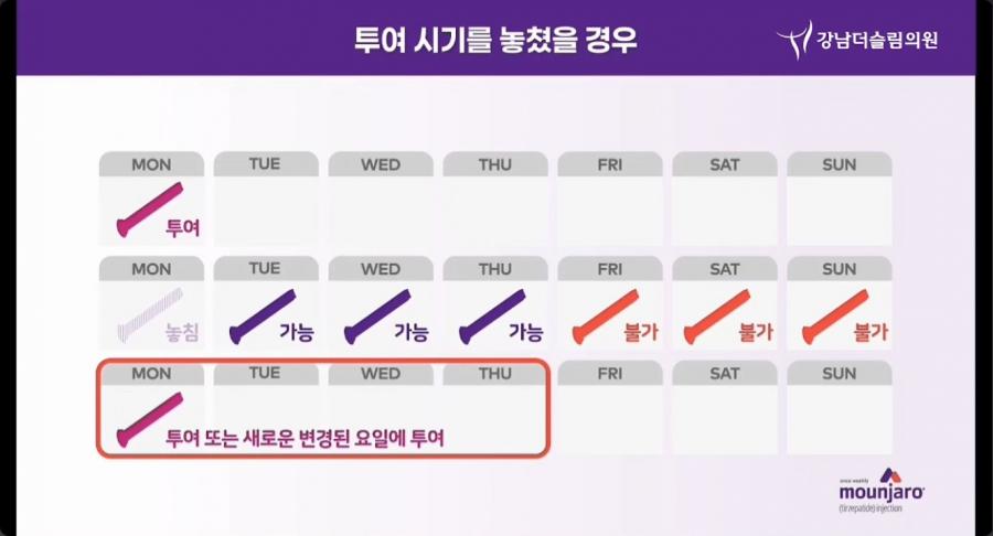 생각나는 즉시 투여합니다. 이후에는 원래 예정된 요일 또는 새로 변경된 요일로 정기적인 주 1회 투여 일정을 재개할 수 있습니다.